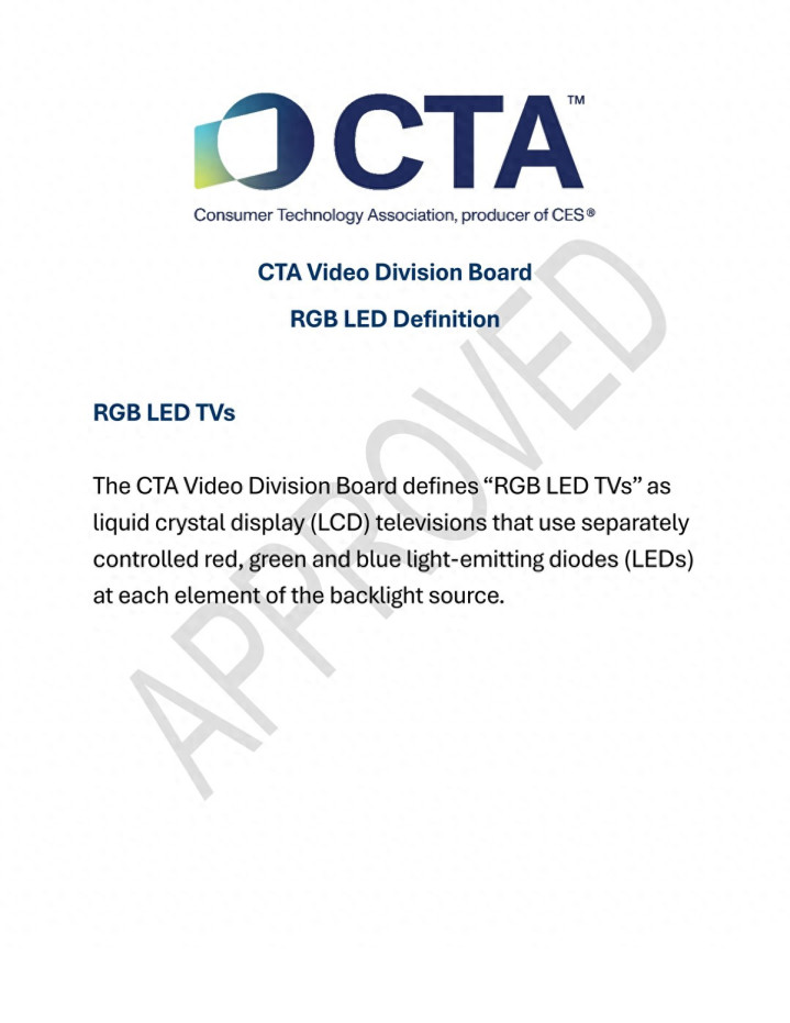 当作领有超百年历史、CES控制方,以及巨匠“4K Ultra HD”“8K”“HDR”等历代电视清楚中枢要领的制定者,CTA初次明确界定中枢准则:RGB-Mini LED电视必须在背光光源的每一个单元,杀青红、绿、蓝三色LED独处法例,为巨匠RGB LED电视开采合规标尺。