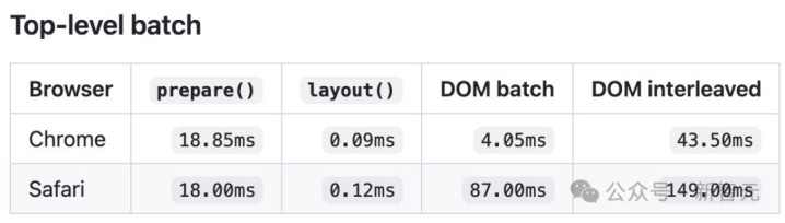 Safari上更夸张,layout 0.12毫秒,DOM交错测量149.00毫秒,快了超1242倍——整整三个数目级。