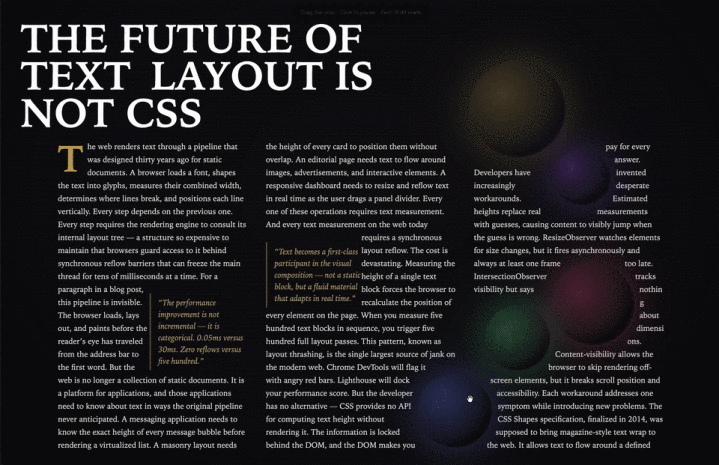 此时此刻,全网王人千里浸于Pretext的视觉盛宴中。那些直出排版的demo,好意思得压根不像网页。