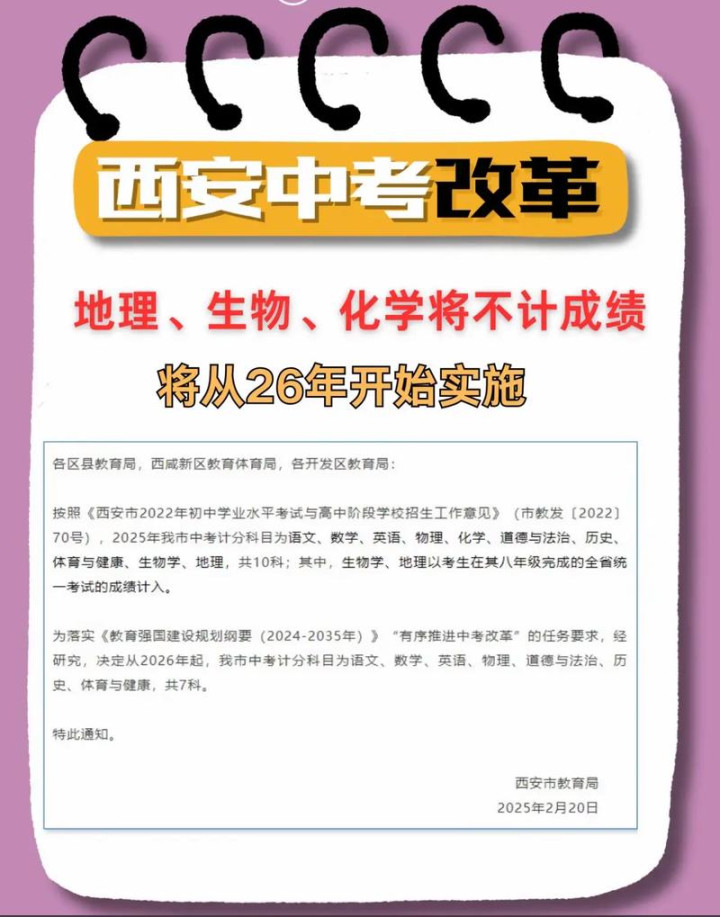 近期,寰宇多地教诲部门密集发布中考校正示知,一项影响万千初中生的战略讲求落地:自2027年起,生物学、地舆不再计入中考总分,调整为锤真金不怕火科目,收获以等级呈现。吉林、安徽黄山、江西吉安、陕西咸阳等地已明确笃定,战略中枢直指收缩学生学业背负、弱化过度分数竞争,让初中教诲记忆育东说念主本色。