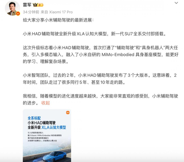 本日上昼,小米创举东说念主雷军在微博共享小米提拔驾驶的最新发达。他默示,小米HAD提拔驾驶全新升级XLA见解大模子,新一代SU7全系录用即搭载。