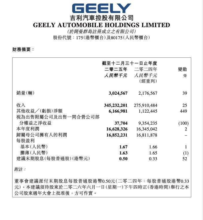 祯祥汽车发布2025年度财报。集团全年销量毁坏302万辆,滚球app中国官方网站创下历史新高。交易收入达到3452亿元。收入同比增长25%。包摄母公司推动的净利润为168.5亿元。每股基本盈利1.67元。