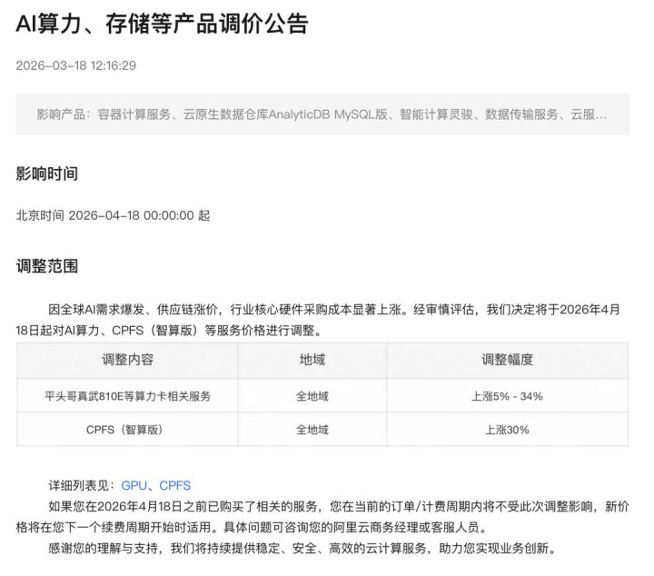 阿里云官网发布公告:因大家AI需求爆发、供应链加价,阿里云AI算力、存储等居品最飞腾价34%。其中,平头哥真武810E等算力卡居品飞腾5%-34%,文献存储居品CPFS(智算版)飞腾30%。新的价钱齐将于北京时间 2026-04-18 00:00:00 起推论。