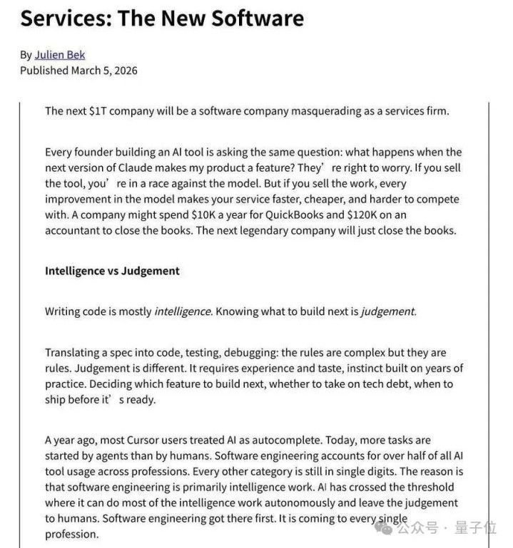 红杉合股东谈主Julien Bek在其著述“Service is the new software”(处事即新软件)中提倡: