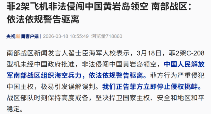 南部战区新闻发言东谈主翟士臣舟师大校示意,3月18日,菲2架C-208型机未经中国政府批准,行恶侵闯中国黄岩岛领空,中国东谈主民自若军南部战区组织海空军力,照章依规警告驱离。菲方算作严重侵犯中国主权,极易激励扭曲误判。咱们正告菲方立即罢手侵权寻衅。战区戎行时辰保捏高度收敛,坚决捍卫国度主权、安全和地区和平踏实。
