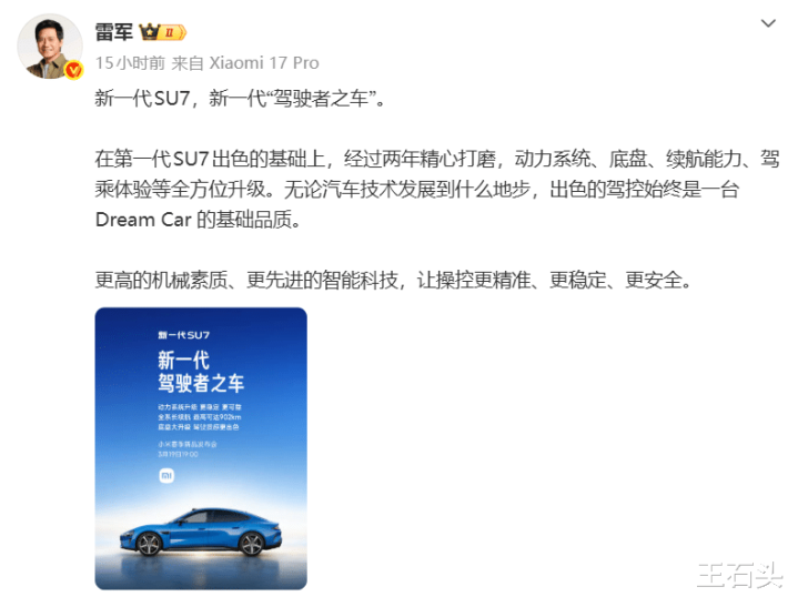 两年后的今天,当新一代SU7的预报悄然上线,雷军再次发声,此次他的界说愈加精确、也愈加细则,这是新一代“驾驶者之车”。