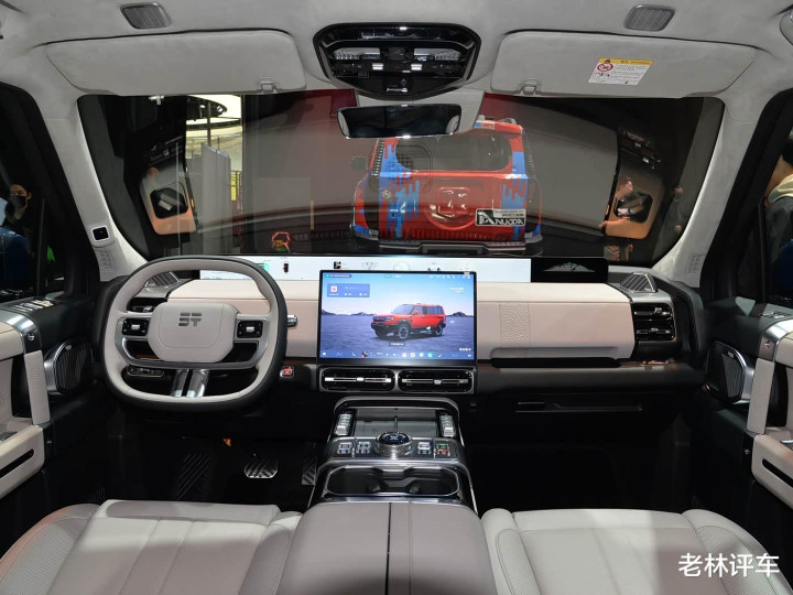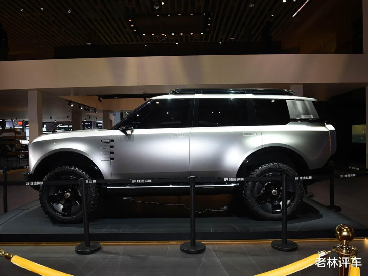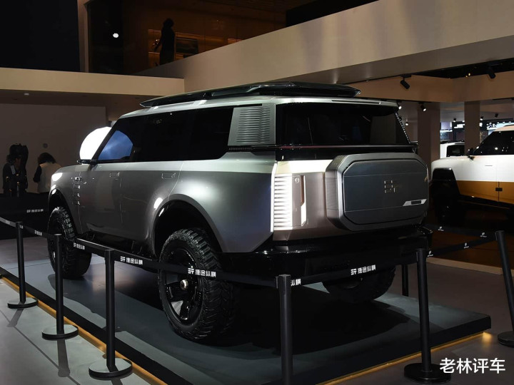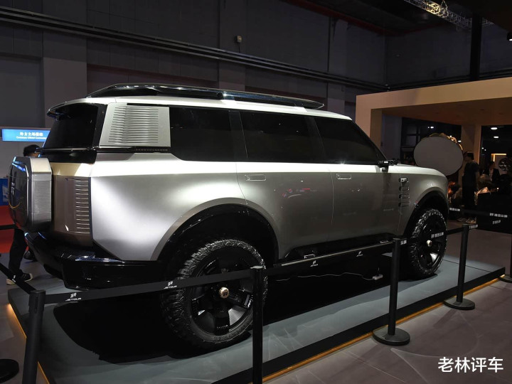 车侧部分,主要以笔直线条为主,车身显得比拟干练,该车的A/B/C柱都熏黑了,营造出悬浮式车顶的视觉成果,D柱用一块银色饰板点缀,若是不出随机的话,该车充电时,银色饰板不错流露电量。该车还配备了大尺寸的越野轮胎,轮拱和轮胎之间的距离很大,很显著,这瑕瑜承载式车体结构带来的成果。
