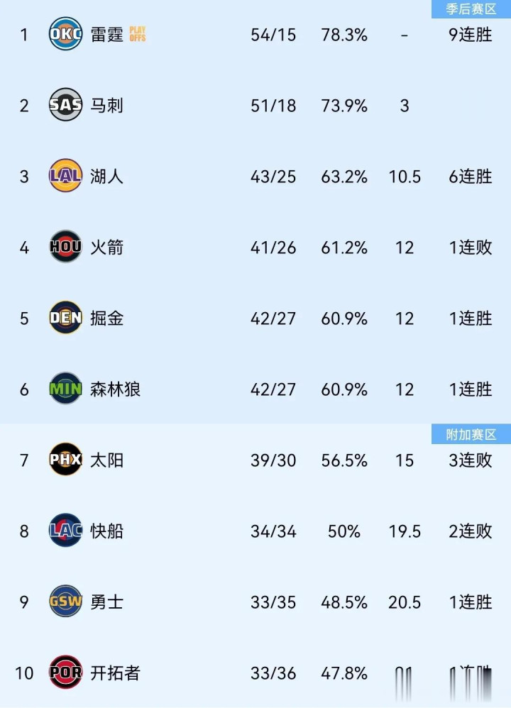NBA惯例赛不竭进行!跟着季后赛投入倒计时,狂野西部的季后赛热点球队也在为终末的名次冲刺,力图以更高名次投入到季后赛备战,为总冠军而战!跟着多场焦点之战落下帷幕,西部最新名次细腻出炉。