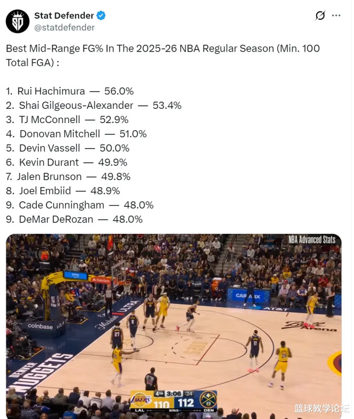 亚历山大长入129场砍下20+,连续刷新我方创造的NBA历史记录。以雷霆的战绩还有亚历山大的数据,他要蝉联通例赛MVP了。再看一组数据,本赛季中距离跳投掷中率,亚历山大53.4%排行定约第二,仅次于八村塁(56%)。