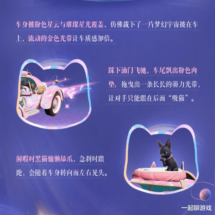 接下来再以“魔法喵窝”为例,车尾飘出粉色猫爪殊效,何况还会出现一条长长的萌力光带,让敌手在车后“吸猫”;通常在欢欣时会有算作发扬,比如黑猫慵懒的舔爪子,急刹时还会蹒跚,何况还会跟着车身动掸标的而傍边晃头。