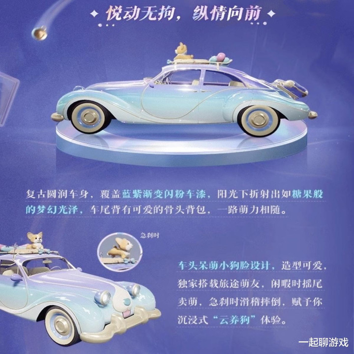 咱们以“旅行汪汪”为例,不仅有蓝紫渐变闪粉,阳光折射出现梦乡晴朗,而且车尾可儿的骨头背包、车顶呆萌小狗,访佛“挂件”一般,在线下时会摇尾卖萌,急刹时还会滑稽跌倒,光子称其是“云养狗”。