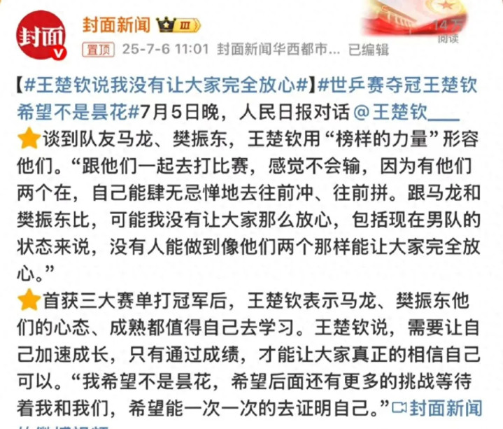 时刻回到2025年7月,彼时碰巧拿到首个世乒赛冠军的巅峰。采纳东谈主民日报对话时,他初次提到我方“可能莫得让全国那么省心”。