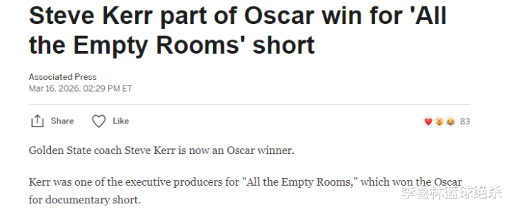 金州枭雄队主解说史蒂夫・科尔也成为了奥斯卡奖得主。科尔是记载片短片《静室为证(All the Empty Rooms)》的本质制片东谈主之一,该片荣获2026年奥斯卡最好记载短片奖。