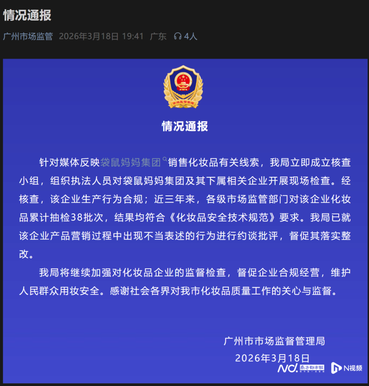3月18日晚,广州市市集监督处置局发布情况通报,已对袋鼠姆妈集团在家具营销经由中出现不妥表述的举止进行约谈月旦,督促其落实整改。