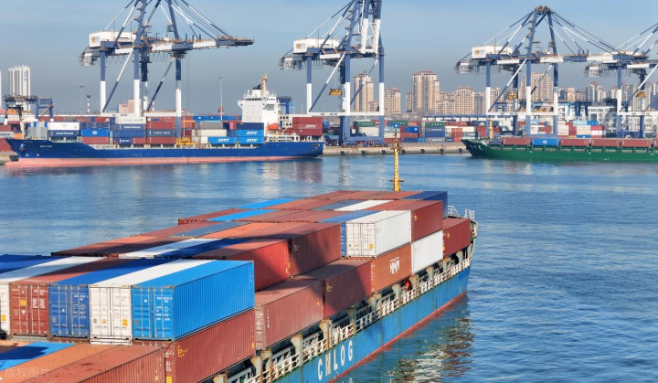 图 | 货轮在山东口岸烟台港装卸集装箱