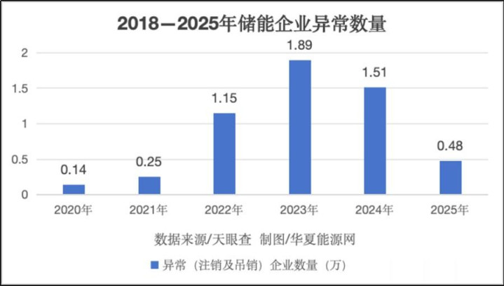 天眼查涌现,截止现在,照旧处于荒谬(包括刊出及撤消)的储能企业共6.3万家。其中,2025年为4800家,2024年为1.5万家,2023年为1.9万家,2022年为1.15万家,2021年为2500家。