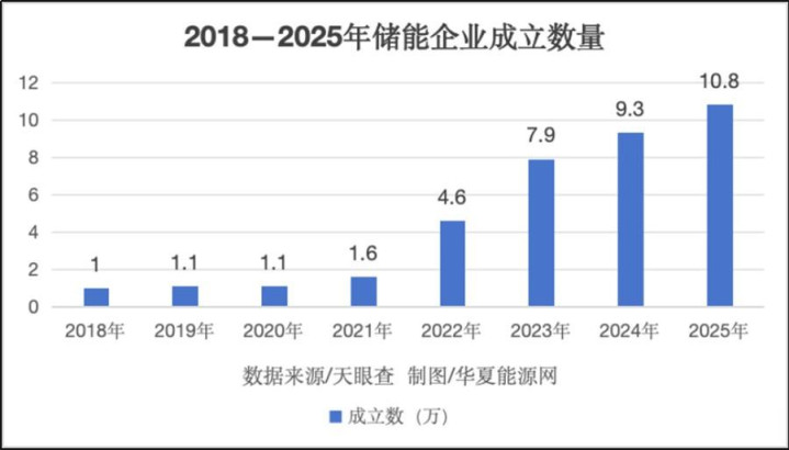 天眼查涌现,现在,国内已设立的储能企业数目在43.6万家以上,其中仅2025年一年便有10.8万家新设立的企业,2024年是9.3万家,2023年是7.9万家,2022年是4.6万家,更早的2021年,是1.6万家,而2019年之前,每年设立的储能数目只好几千家。